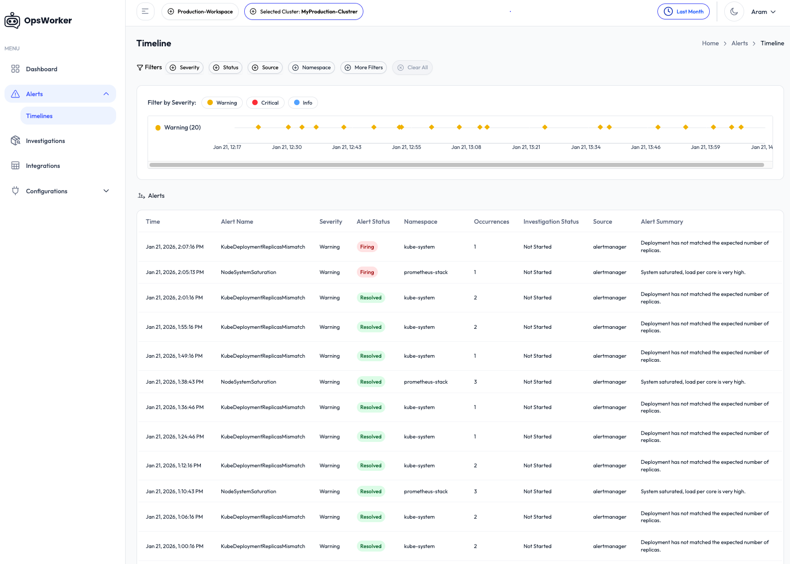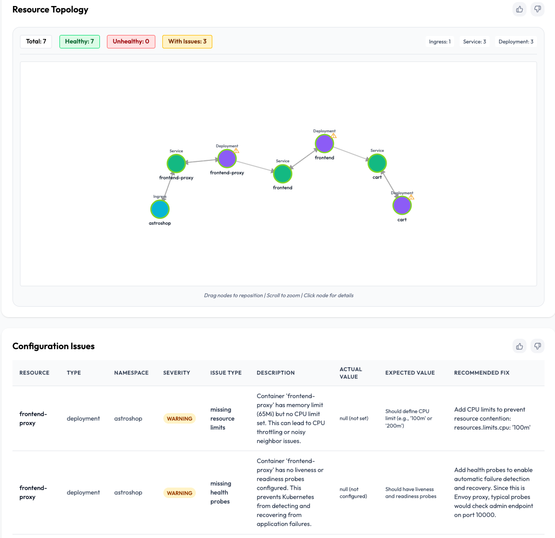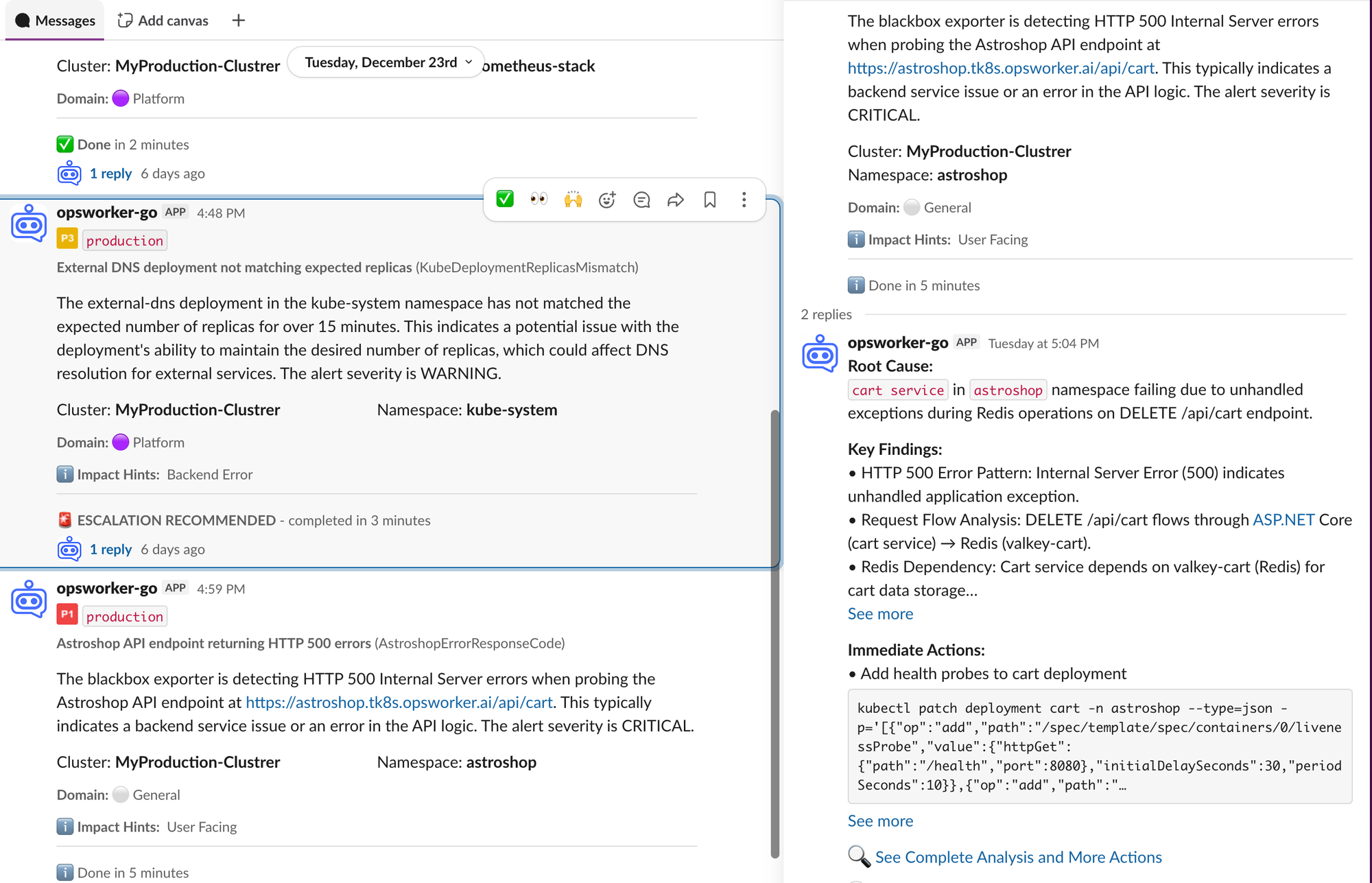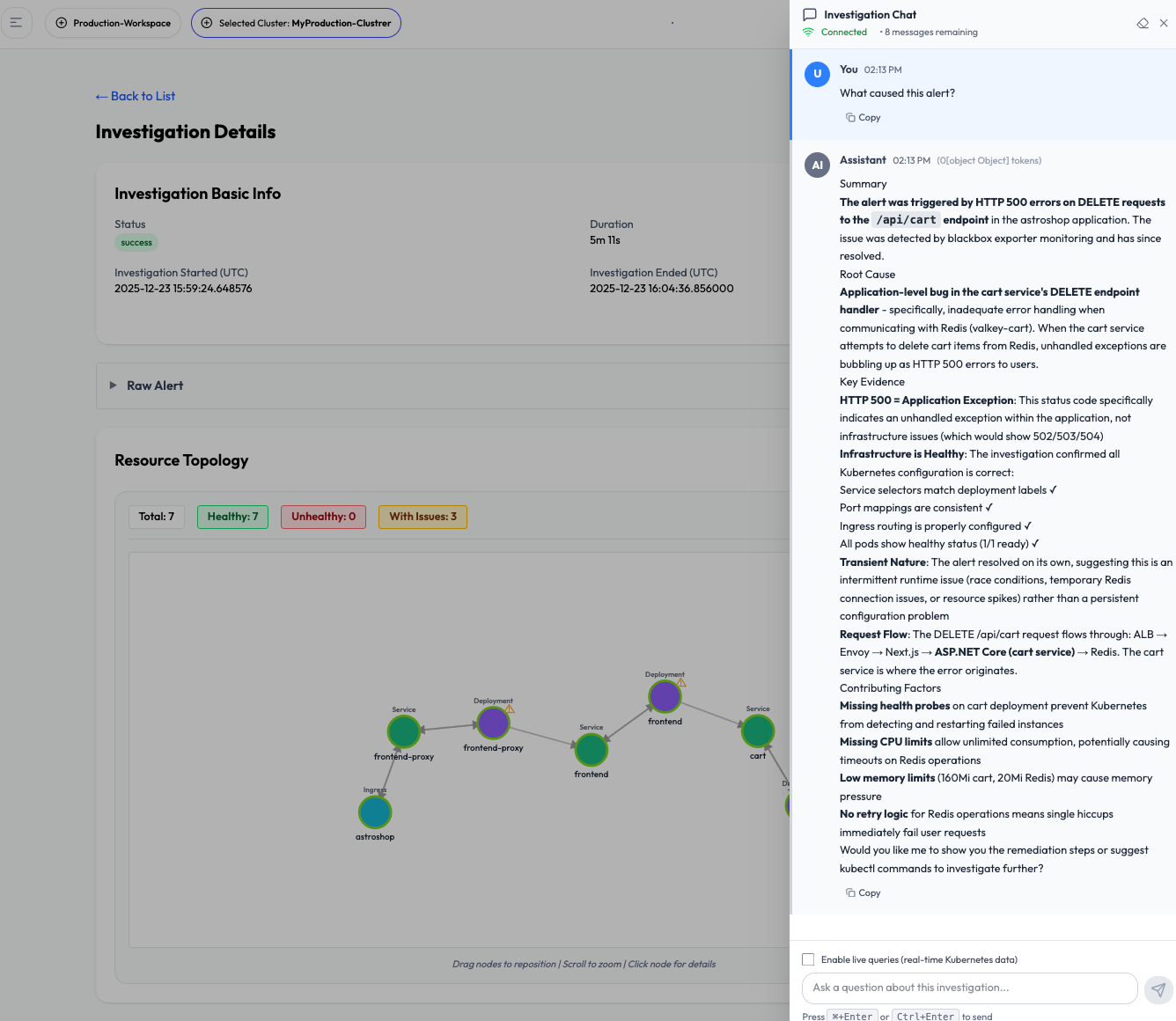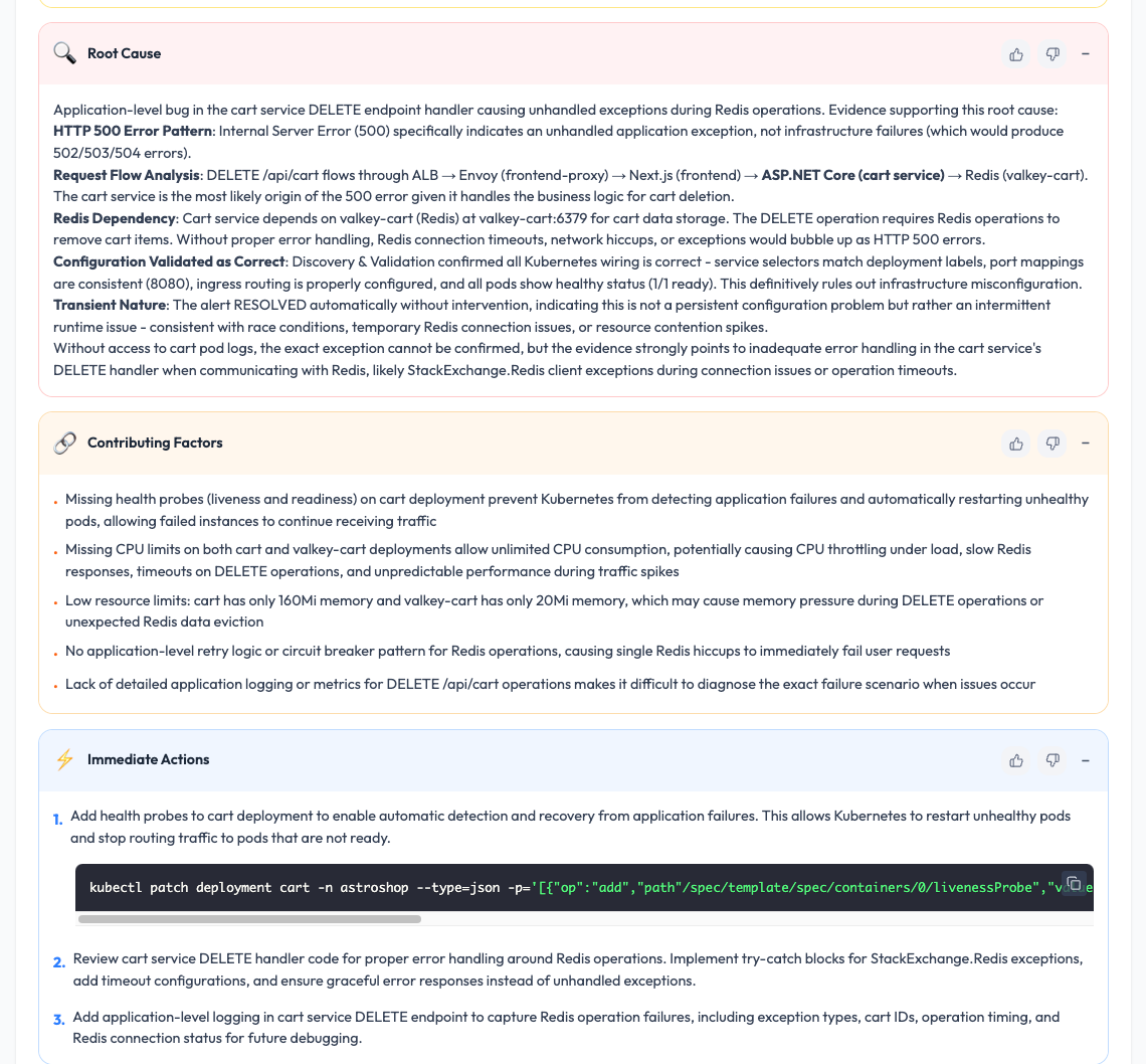 OpsWorker automatically parses alerts, discovers Kubernetes and service relationships, validates configurations, and generates structured incident investigations: