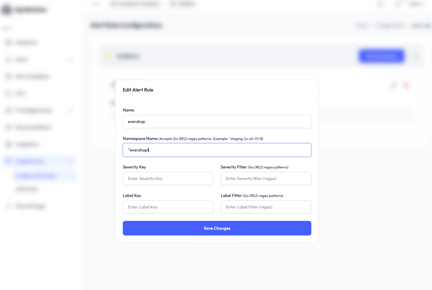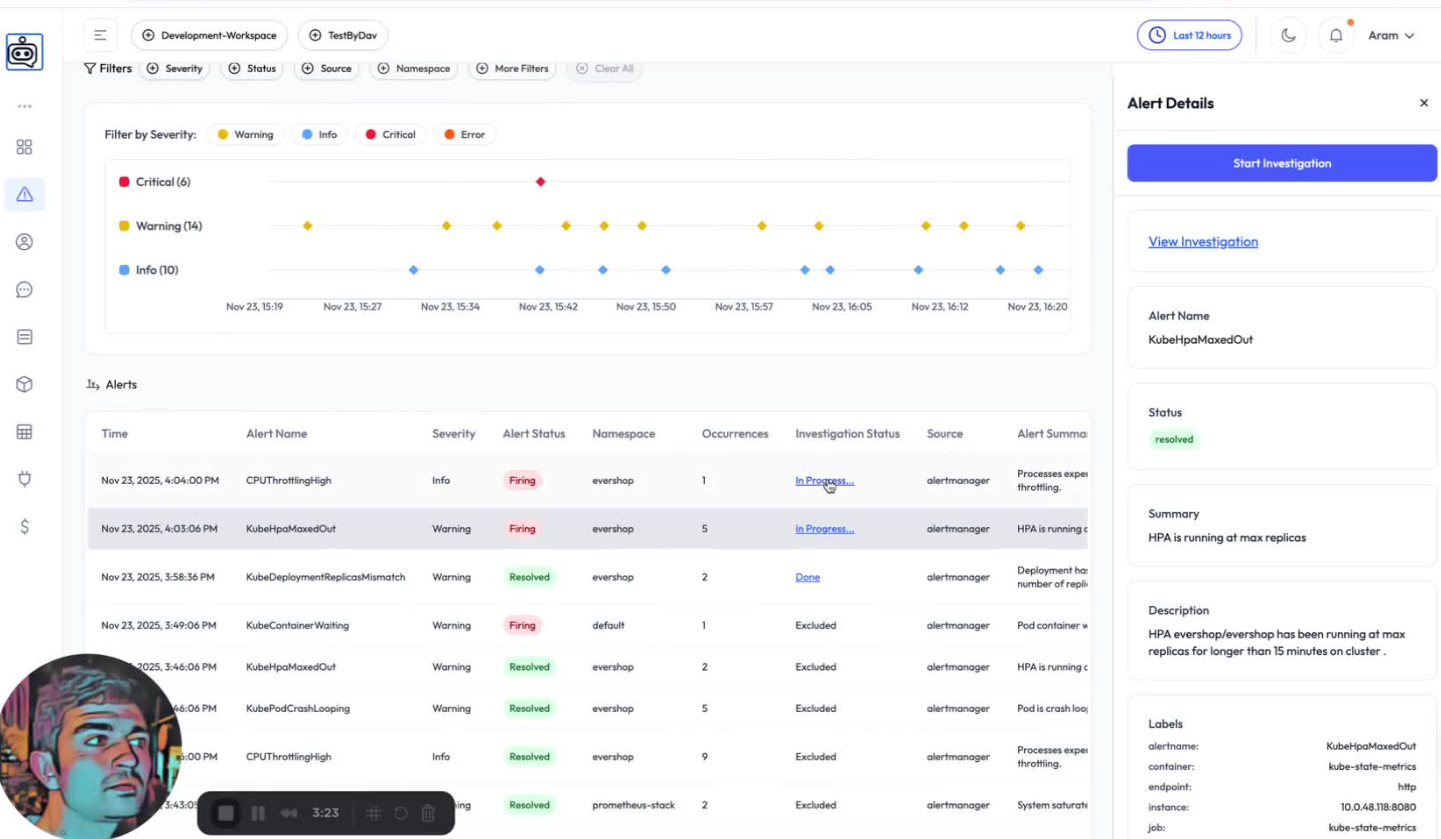 Before diving into the incidents, we configured OpsWorker to automatically investigate only alerts coming from the evershop namespace — a Node.js–based shop application using AWS RDS.