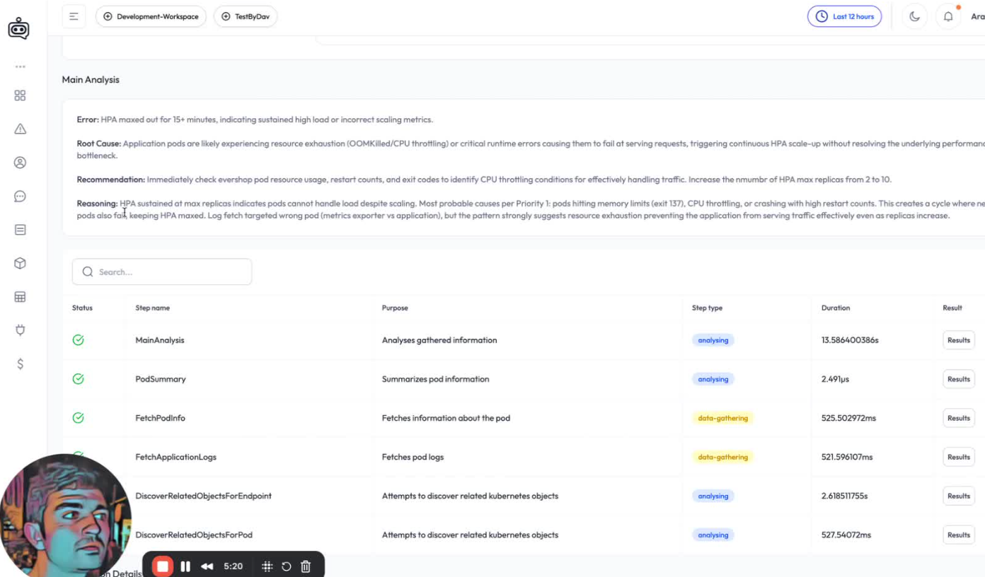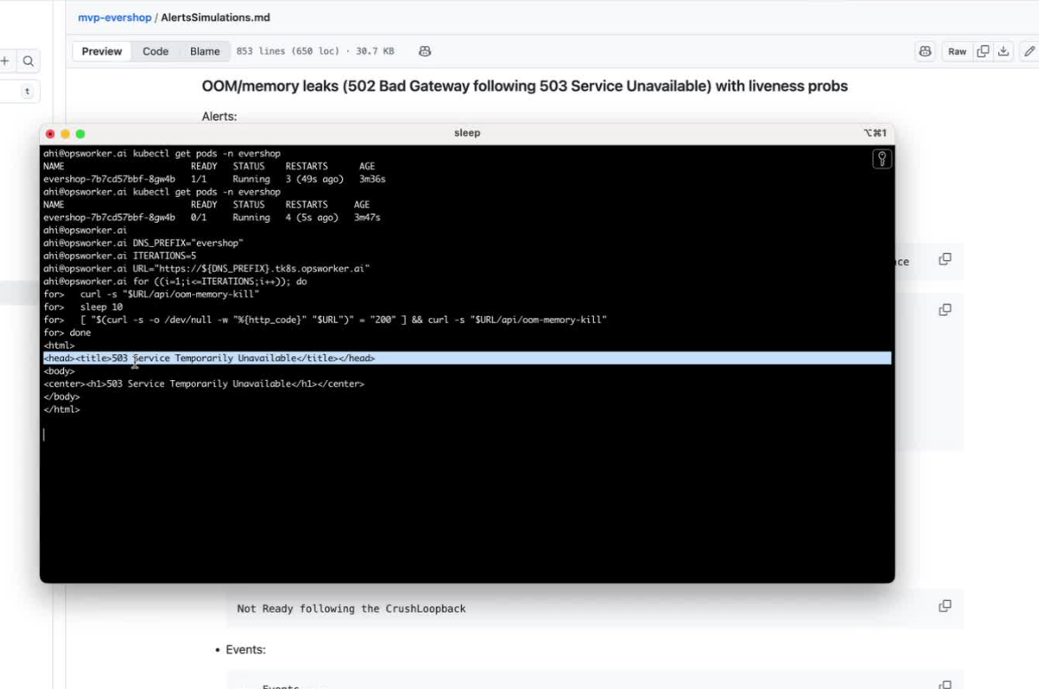 Next, we simulated a memory leak that forces the pod into OOMKill, followed by liveness probe failures and cascading 503 errors — a problem many teams have had to chase manually.