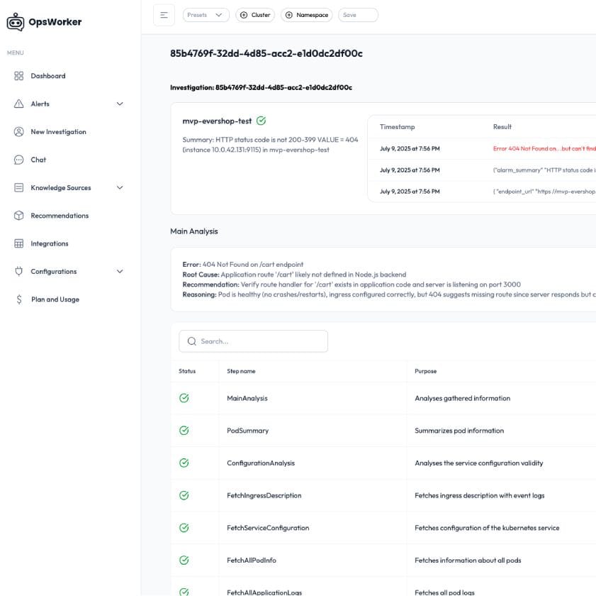 OpsWorker runs AI investigations, analyzing logs, configs, and services to pinpoint the root cause and give clear remediation steps.