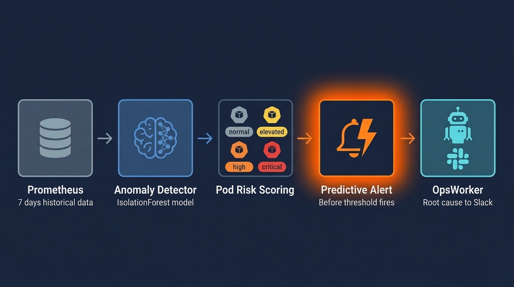 The reactive investigation workflow - alert fires, OpsWorker investigates, root cause delivered to Slack - handles the majority of incidents well. Predictive analytics adds a proactive layer on top: a small percentage of failures are slow-building enough that early detection changes the outcome from incident-and-recovery to problem-identified-and-fixed-before-users-notice.